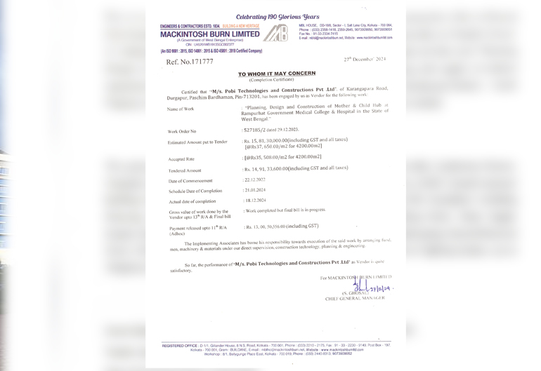 Planning, Design & Constructions Work of 150 Bedded MCH & 50 Bedded CCB at Rampurhat Govt. Medical College & Hospital, Location: Rampurhat, Birbhum, Client: MACKINTOSH BURN LTD, Project Cost: Rs.30.00 Crores